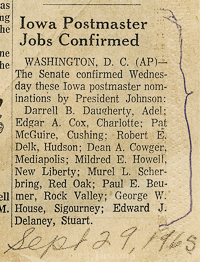 | D00098 | Article from Sept. 29 1965 Des Moines paper stating that Robert Elmer Delk had been confirmed as Postmaster of Hudson, Iowa | John Delk/Elmer Elsworth Delk/Charles Wesley Delk/Robert Elmer Delk/p7lsm_img_2/fullsize/D000098.jpg |