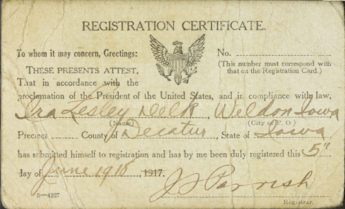 | D00084 | Draft Registration Certificate for Ira Lesley Delk dated 6-5-1918. | John Delk/Elmer Elsworth Delk/Ira Leslie Delk/p7lsm_img_2/fullsize/D000084.jpg |