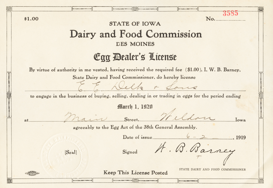 | D00052 | Egg Dealer's License for E.E. Delk and Son's Weldon, Iowa Issued March 01, 1919 Elmer Elsworth Delk | John Delk/Elmer Elsworth Delk/p7lsm_img_2/fullsize/D000052.jpg |