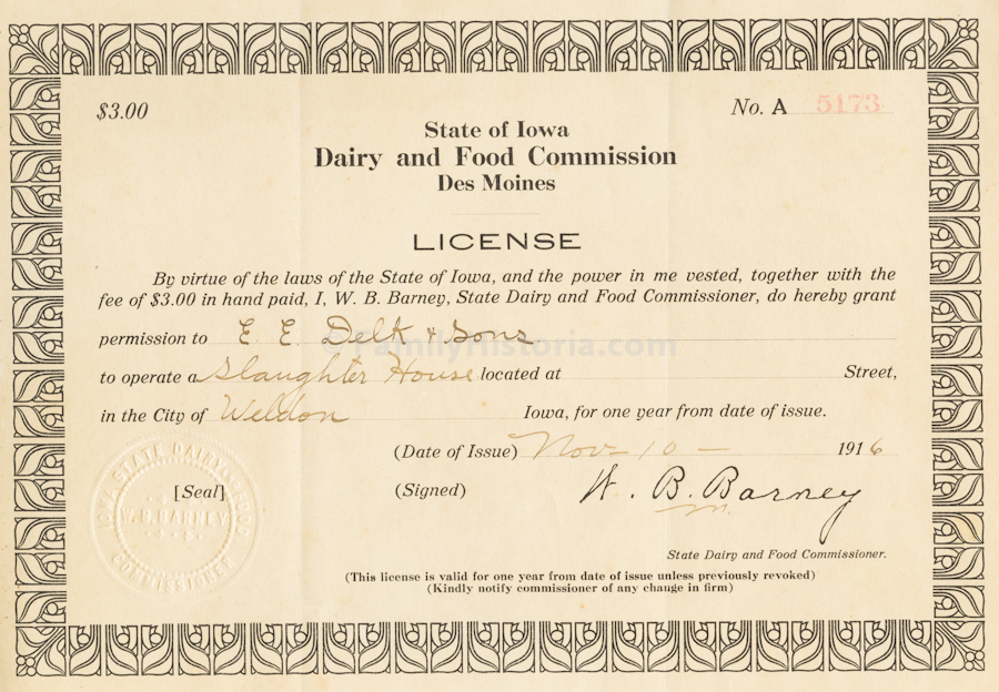 | D00058 | Licence to operate a Slaugheter House for E.E. Delk and Sons, Weldon, Iowa issued November 10, 1916 | John Delk/Elmer Elsworth Delk/p7lsm_img_2/fullsize/D000058.jpg |