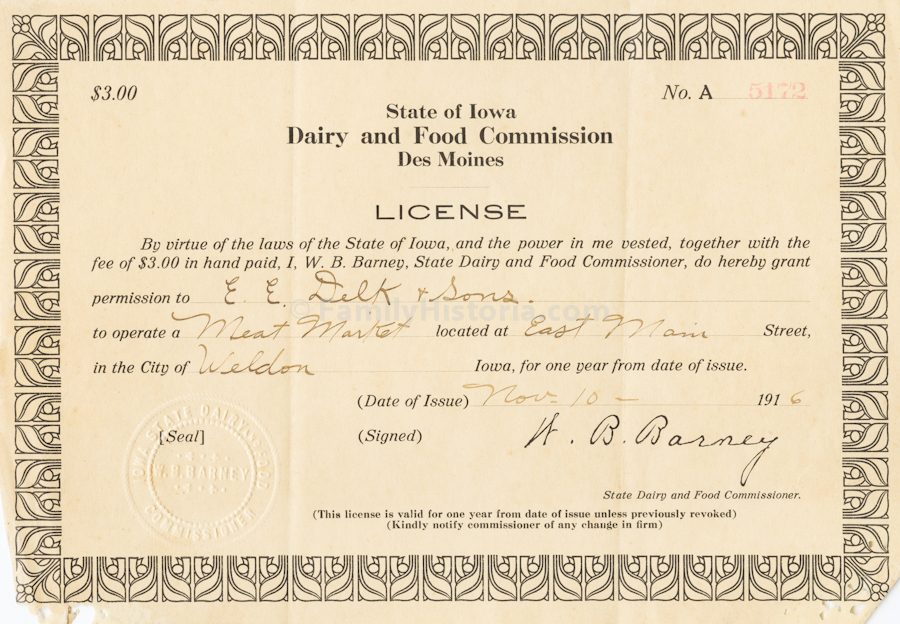 | D00057 | Licence to operate a Meat Market for E.E. Delk and Sons, Weldon, Iowa issued November 10, 1917 | John Delk/Elmer Elsworth Delk/p7lsm_img_2/fullsize/D000057.jpg |
