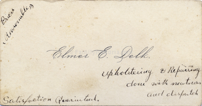 | D00068 | Business card for Elmer E. Delk for upholstering and repairing. On reverse side are the names of his family, 1897 or 1898 | John Delk/Elmer Elsworth Delk/p7lsm_img_2/fullsize/D000068a.jpg |