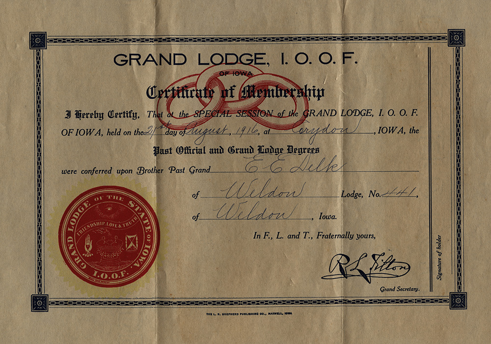 | D00116 | Certificate of Membership for Elmer Elsworth Delk into the Grand Lodge, I.O.O.F. dated August 21, 1916. | John Delk/Elmer Elsworth Delk/p7lsm_img_2/fullsize/D00116.jpg |