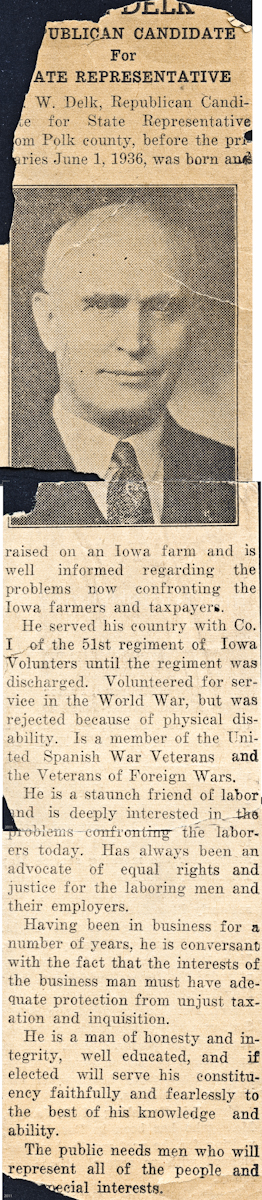 | D00090 | 1936 newspaper article about Dr. James W. Delk's run for State Representative. J.W. Delk was the son of John Henry Delk. | John Delk/John Henry Delk/ElizaJaneGates/p7lsm_img_2/fullsize/D00090.jpg |
