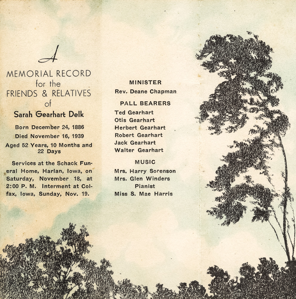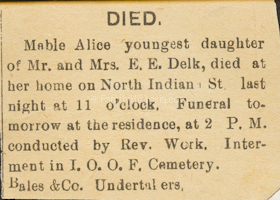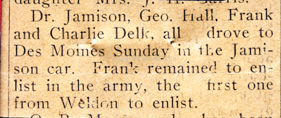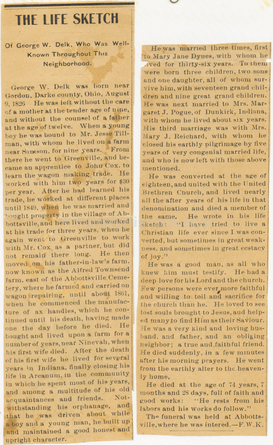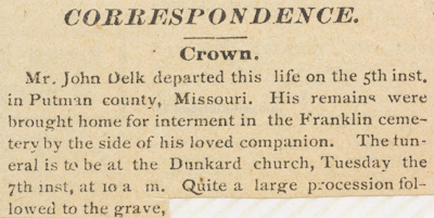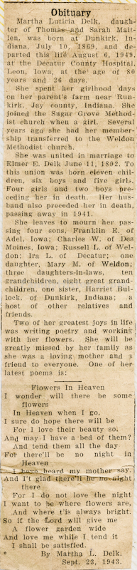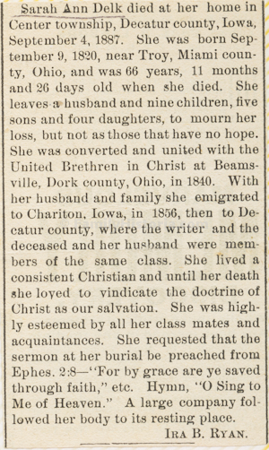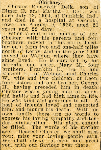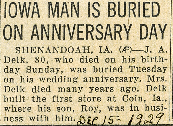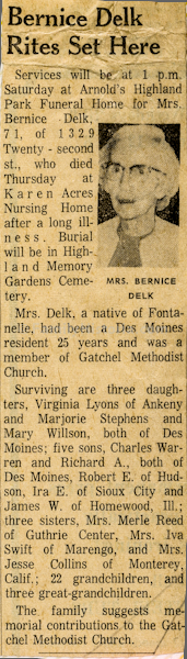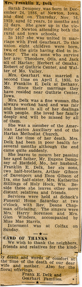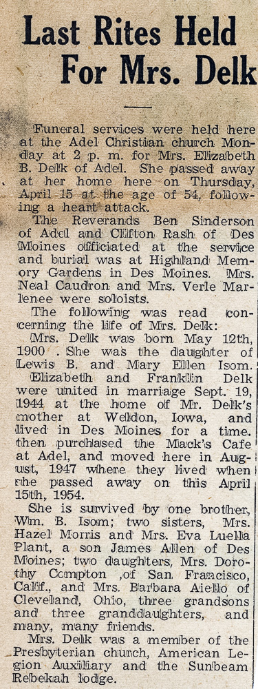 Article from Adel newspaper announcing death of Frank Delk's wife |