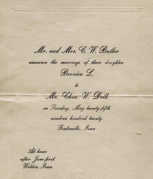 Wedding Announcement for Bernice Luella Buttler and Charles Wesley Delk |