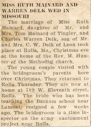 Announcement in paper concerning wedding of Ruth Mainard and Charles Warren Delk |