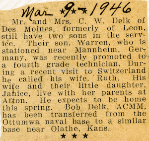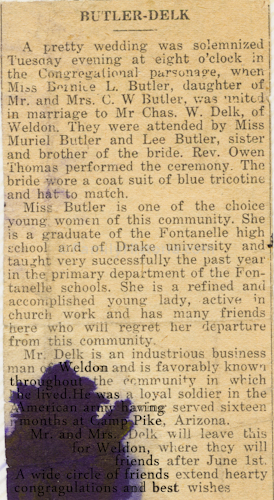Wedding announcement in Des Moines paper for Mary E. Delk and Parker R. Wilson |