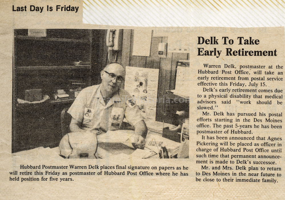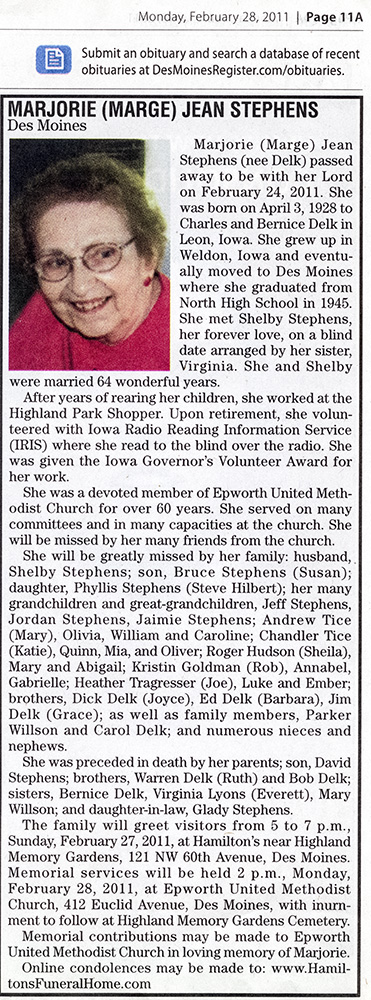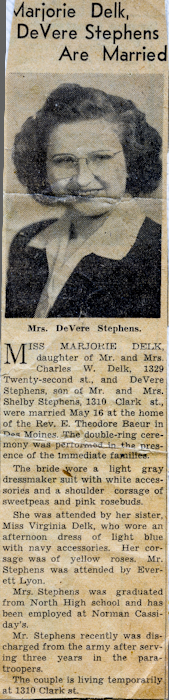Wedding announcement in Des Moines paper for Marge Delk and Sheby Stephens |