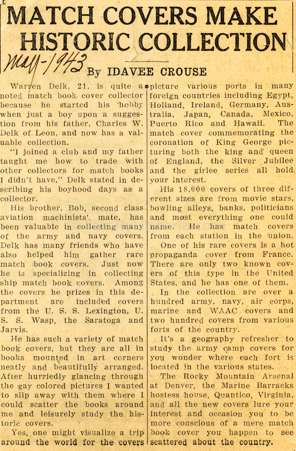 Newspaper article concerning Charles Wesley Delk's collections, 1937 |