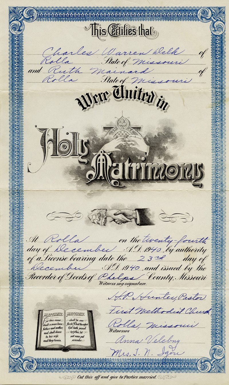 Marriage Certificate for Charles Warren Delk and Ruth Mainard, Dec 24, 1940 |