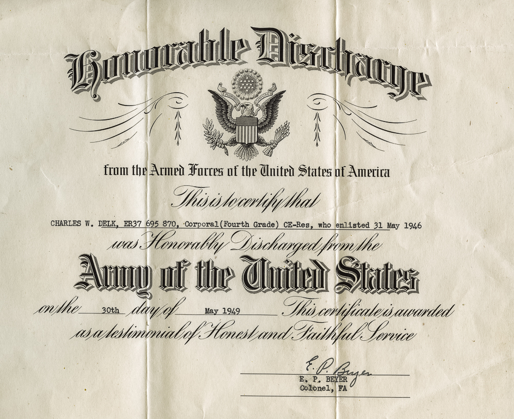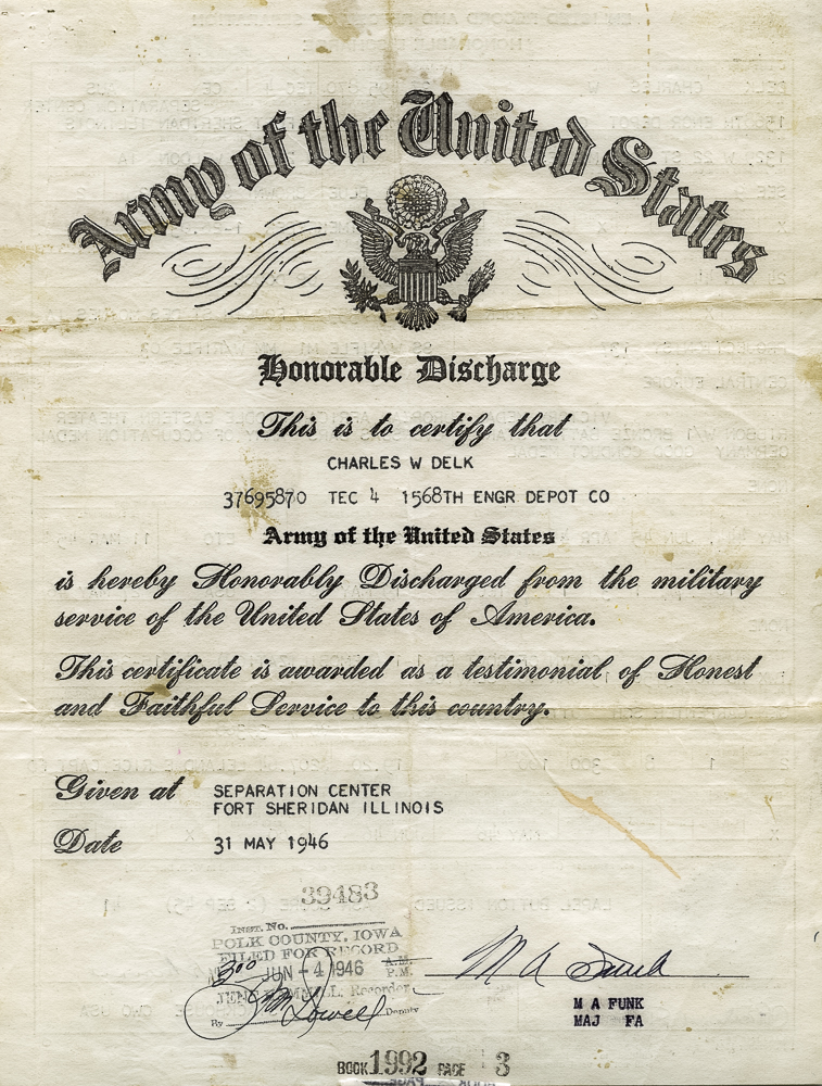 Honorable Discharge certificate for Charles Warren Delk dated May 31, 1946 (from active duty in Army) |