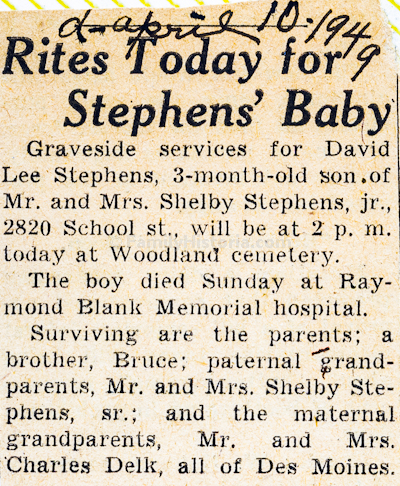 April 10, 1949 newspaper article regarding graveside services for David Lee Stephens, son of Marge Delk and Shelby Stephens |