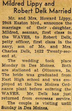 Announcement in paper concerning wedding of Mildred Lippy and Robert Elmer Delk |