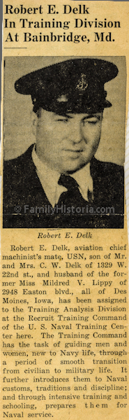 Announcement in paper concerning Robert Elmer Delk naval assignment to Bainbridge, Maryland |
