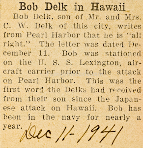 Announcement in paper concerning Robert Elmer Delk following December 07, 1941 attack on Pearl Harbor |