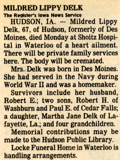 Obituary of Mildred Lippy, wife of Bob Delk |