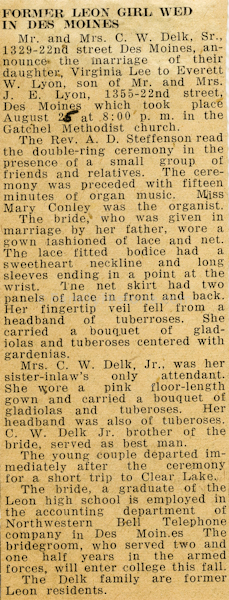 Announcement in paper concerning wedding of Virginia Lee Delk and Everett Wayne Lyon |