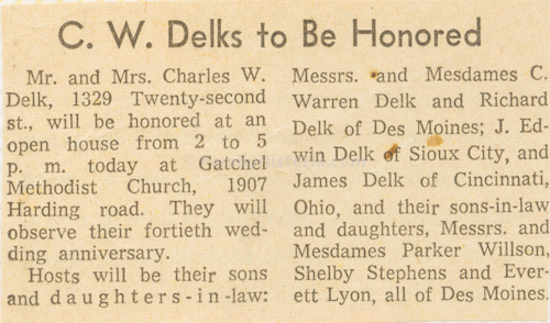 Announcement in paper concerning 40th anniversary celebration for Bernice Luella Butler and Charles Wesley Delk |