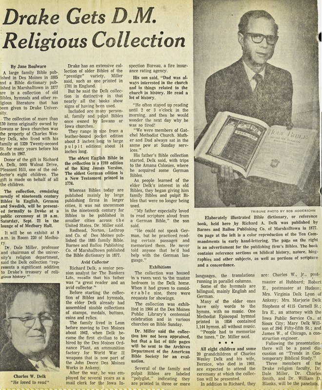 Newspaper article concerning gift to Drake University of the Charles Wesley Delk Bible Collection |