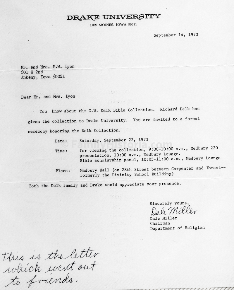 Letter from Drake University inviting Virginia Lee Delk and Everett Wayne Lyon to ceremony honoring the Delk Bible Collection |