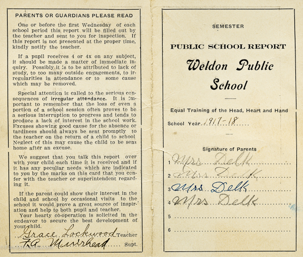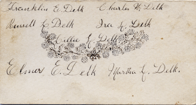 Souvenir of 1908-1909 School year at Gospel Ridge School District No. 3 presented by John C. Duffield, Teacher. Pupils names include Ira Leslie Delk, Charles Wesley Delk and Russell Leland Delk |