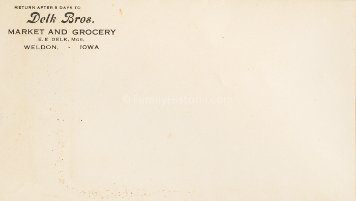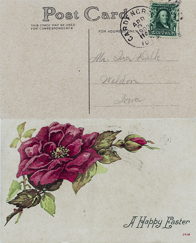 Easter card sent to Ira Leslie Delk from Garden Grove, Iowa dated April 09, 1909. Card was not signed. |