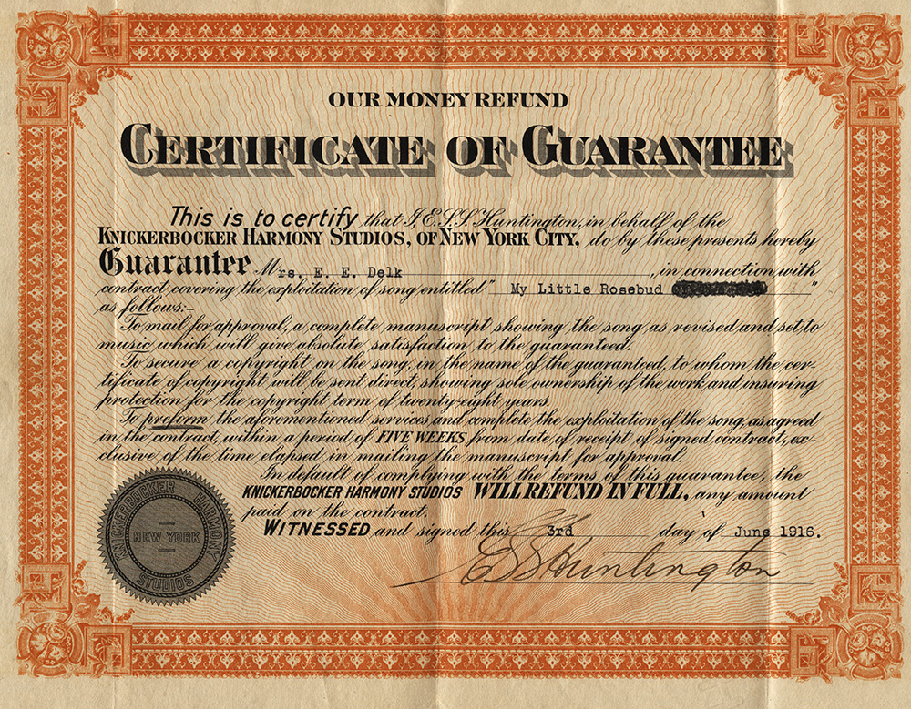 Certificate of Guarantee issued June 03 1916 to Mrs. E.E. Delk (Martha Luticia Maitlen) for her poem (song) titled "My Little Rosebud" |