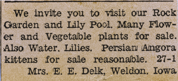 Article from newspaper inviting people to visit her Rock Garden and Lilly Pool. From Martha Lutecia (Maitlen) Delk. Probably from early 1930's |