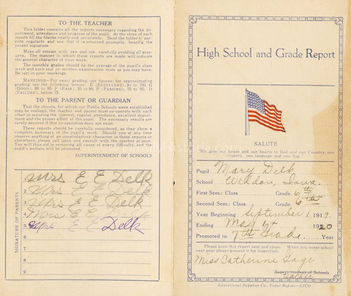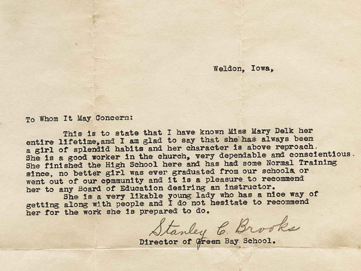 Undated recommendation for Mary May Delk written by the Director of Green Bay School. Probably written in 1927 or 1928. Green Bay was a rural school in Clarke County, Iowa. |