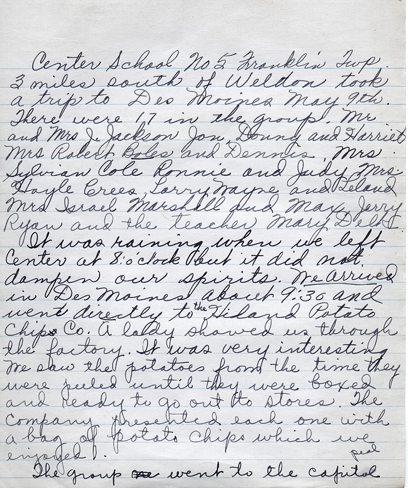 Notes from school trip to Des Moines prepared by Mary May Delk. Date Unkown |