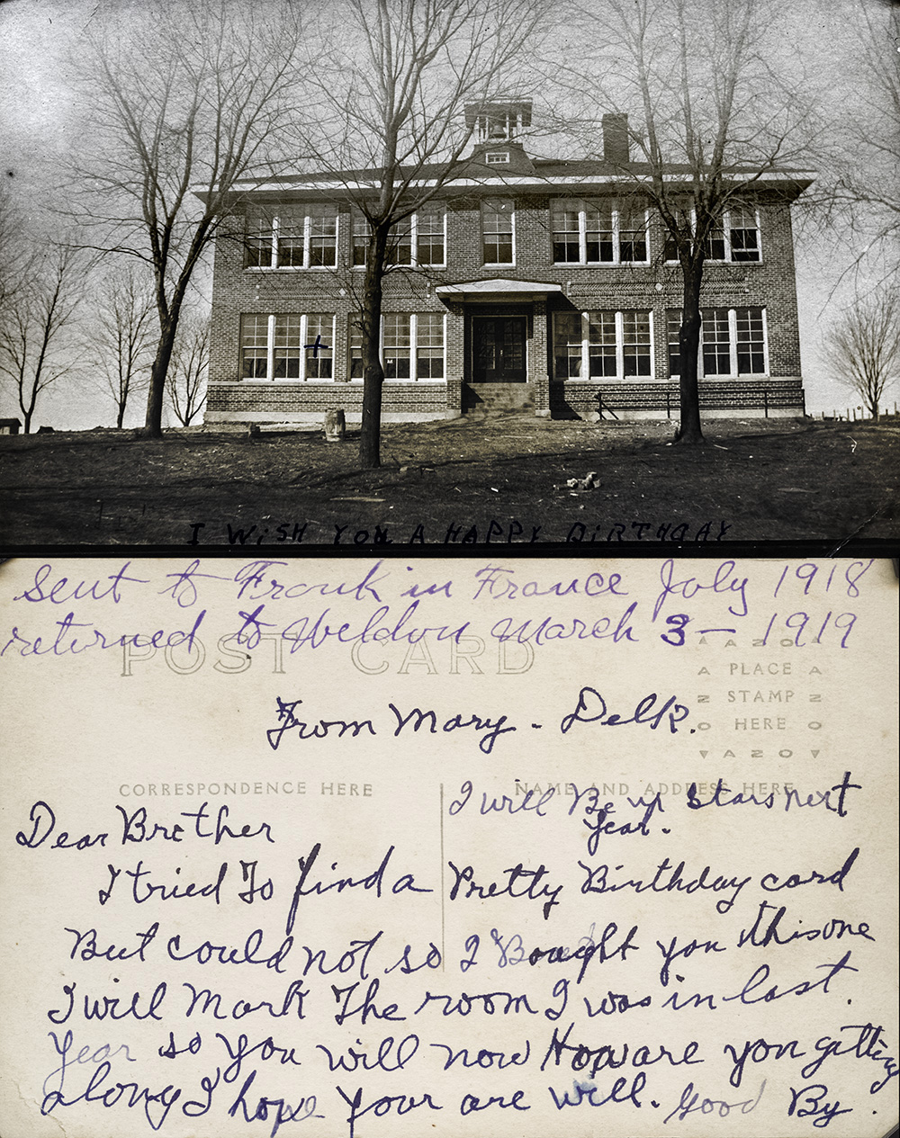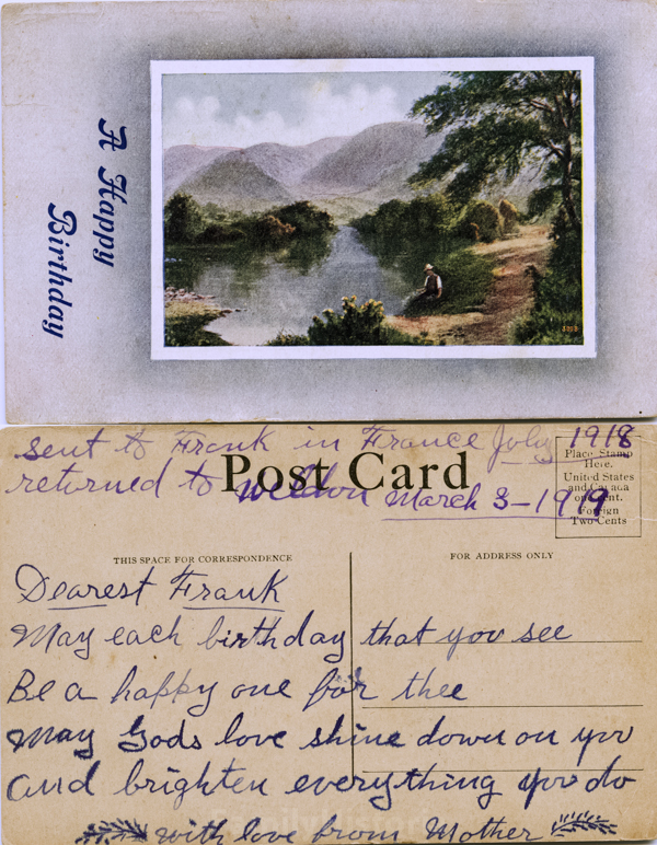 Birthday Card sent to Franklin Elsworth Delk by Mary May Delk. Sent July 1918, returned March 03, 1919. |