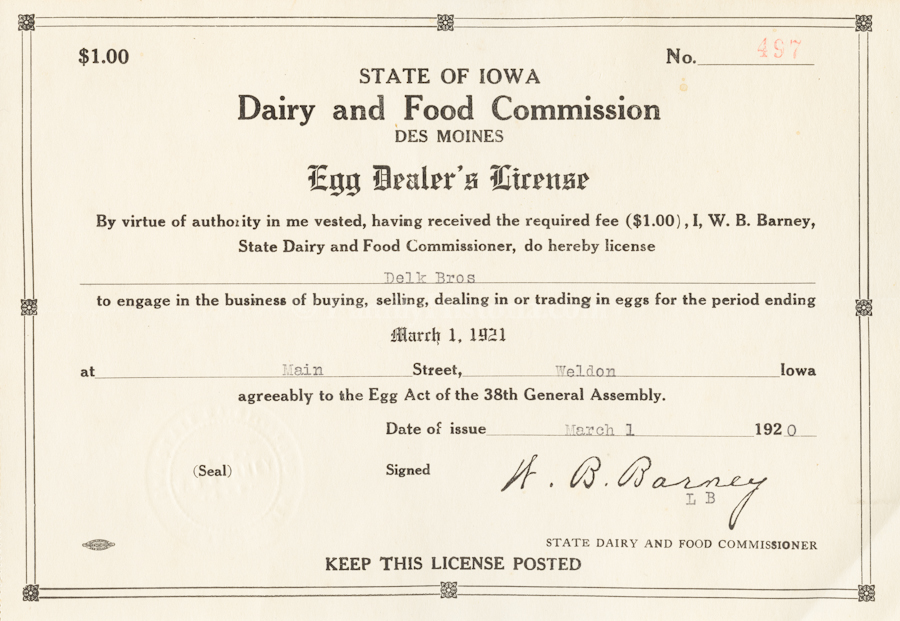 Egg Dealer's License for Delk Brothers, Weldon, Iowa Issued March 01, 1920, Elmer Elsworth Delk |
