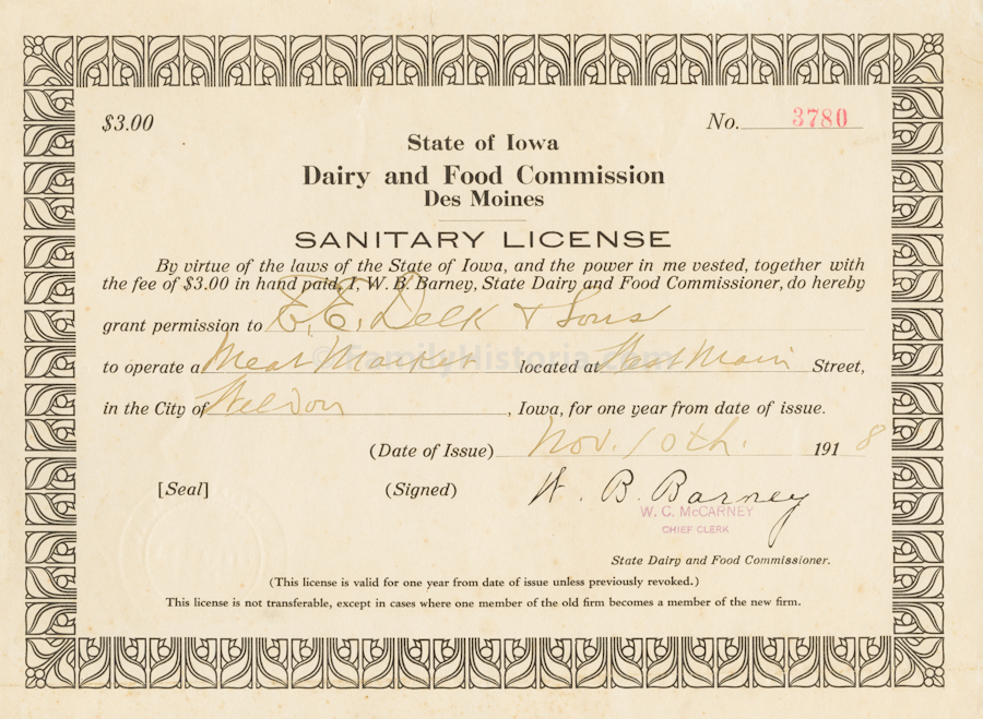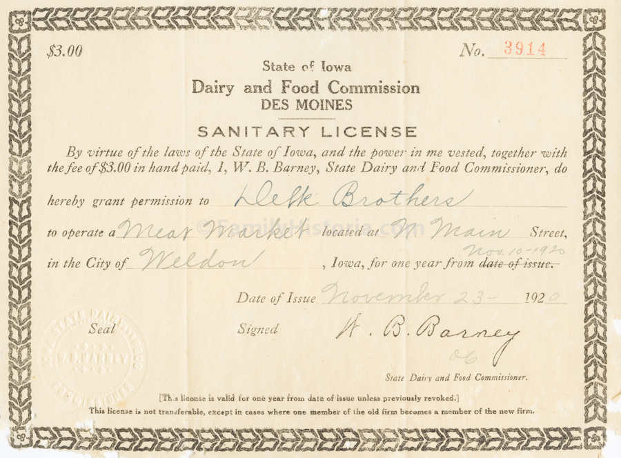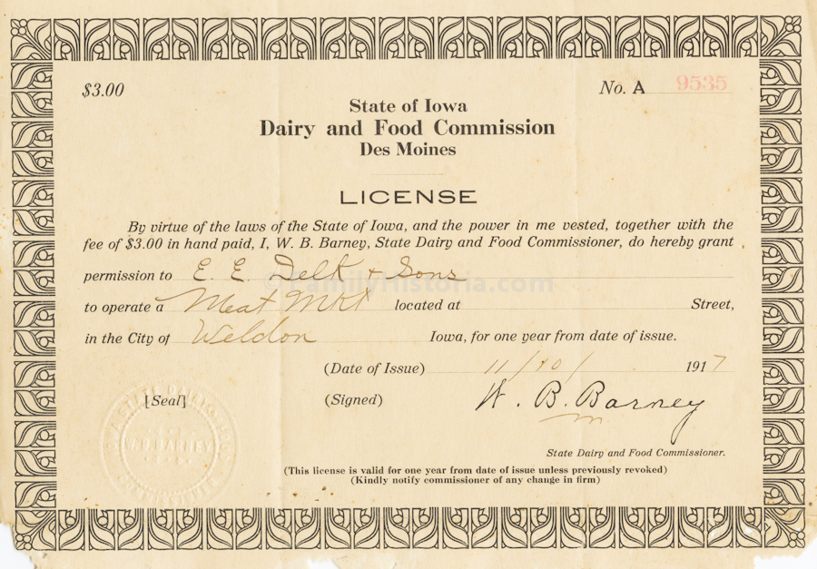License to operate a Meat Market for E.E. Delk and Sons, Weldon, Iowa issued November 10, 1917 |