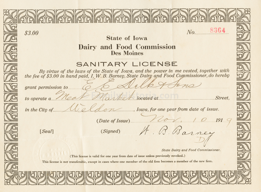 Sanitary License for E.E. Delk and Son's Weldon, Iowa Issued November 10, 1919 |