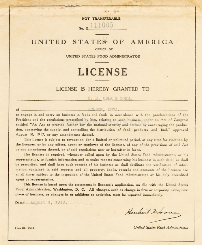 License from United States Food Administraton for E.E. Delk and Son's Weldon, Iowa Issued August 03, 1918 |