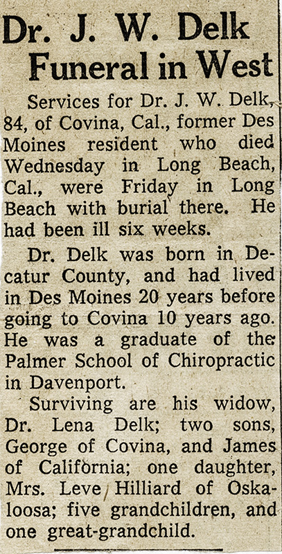 Article from Des Moines newspaper announcing the death of Frank E. Delk |