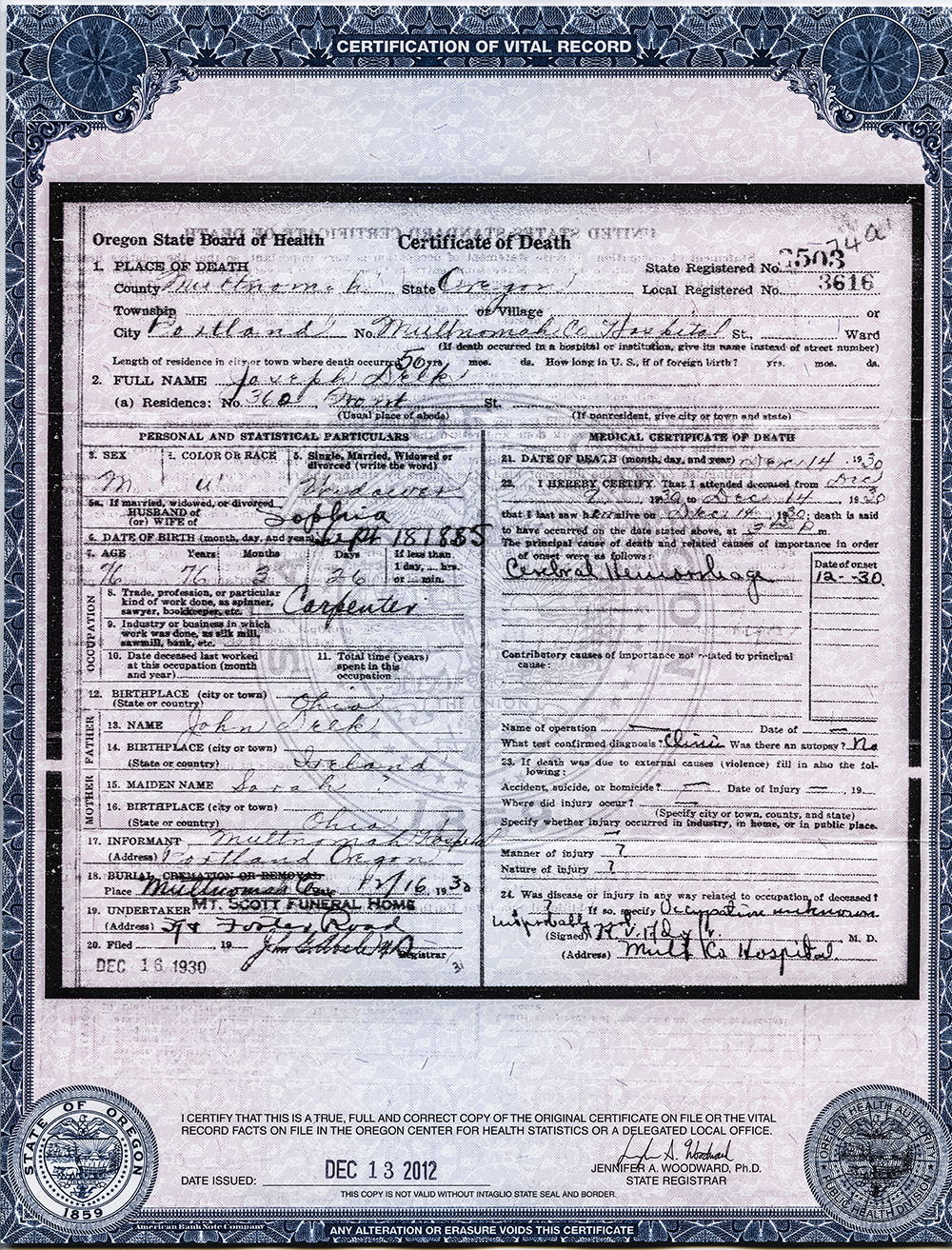 Death Certificate of Joseph Theodore Delk, Issued from the State of Oregon |