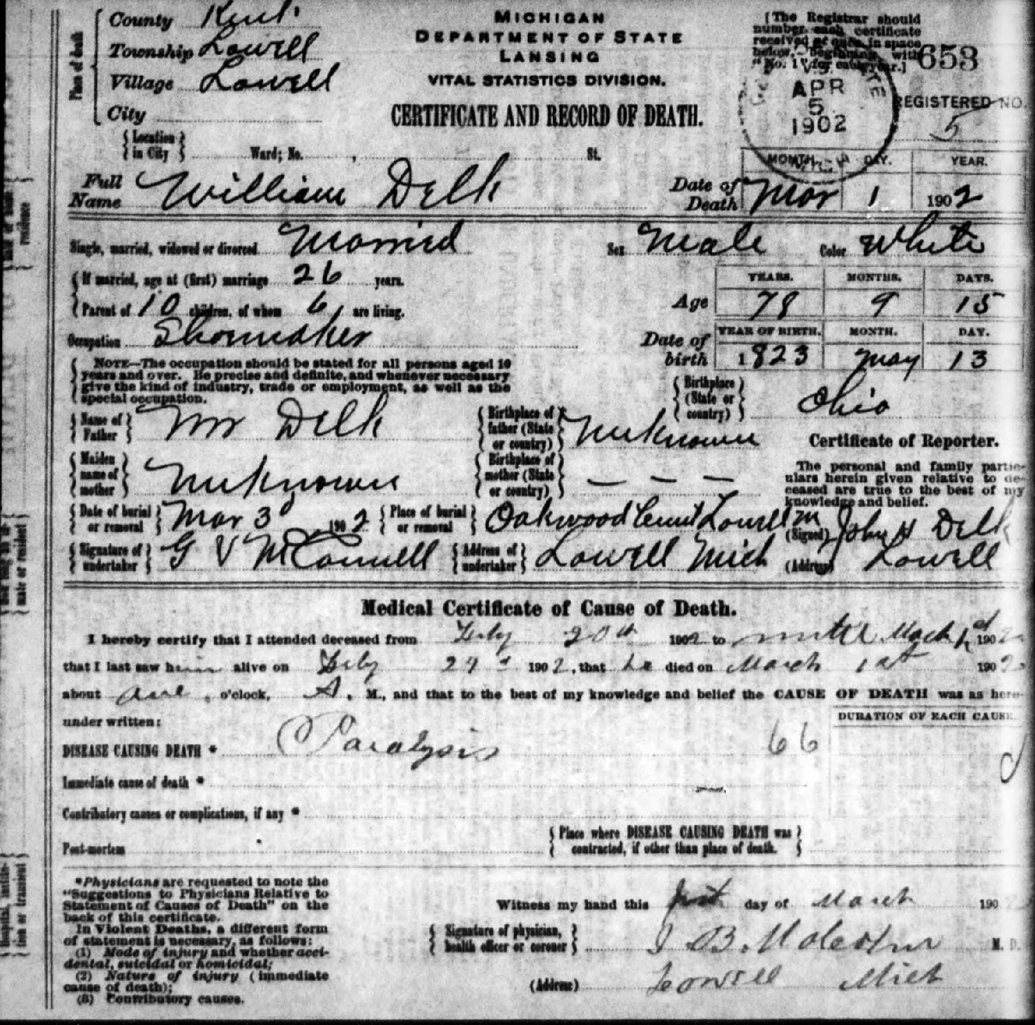 Death Certificate of William Delk, issued by the State of Michigan. Aquired from Ancestry.com |