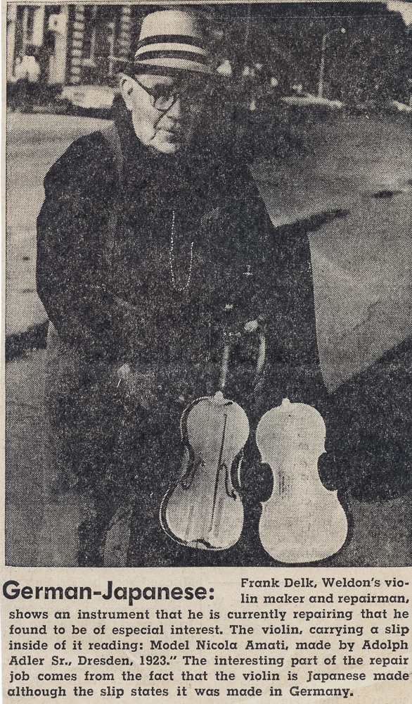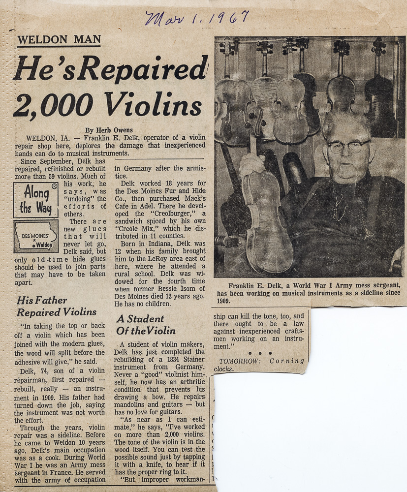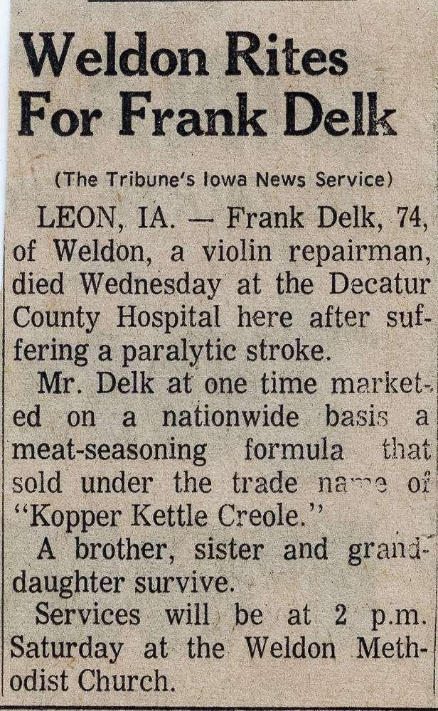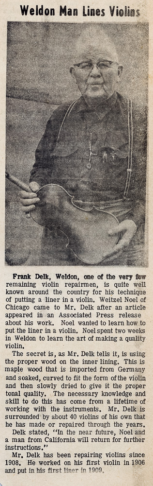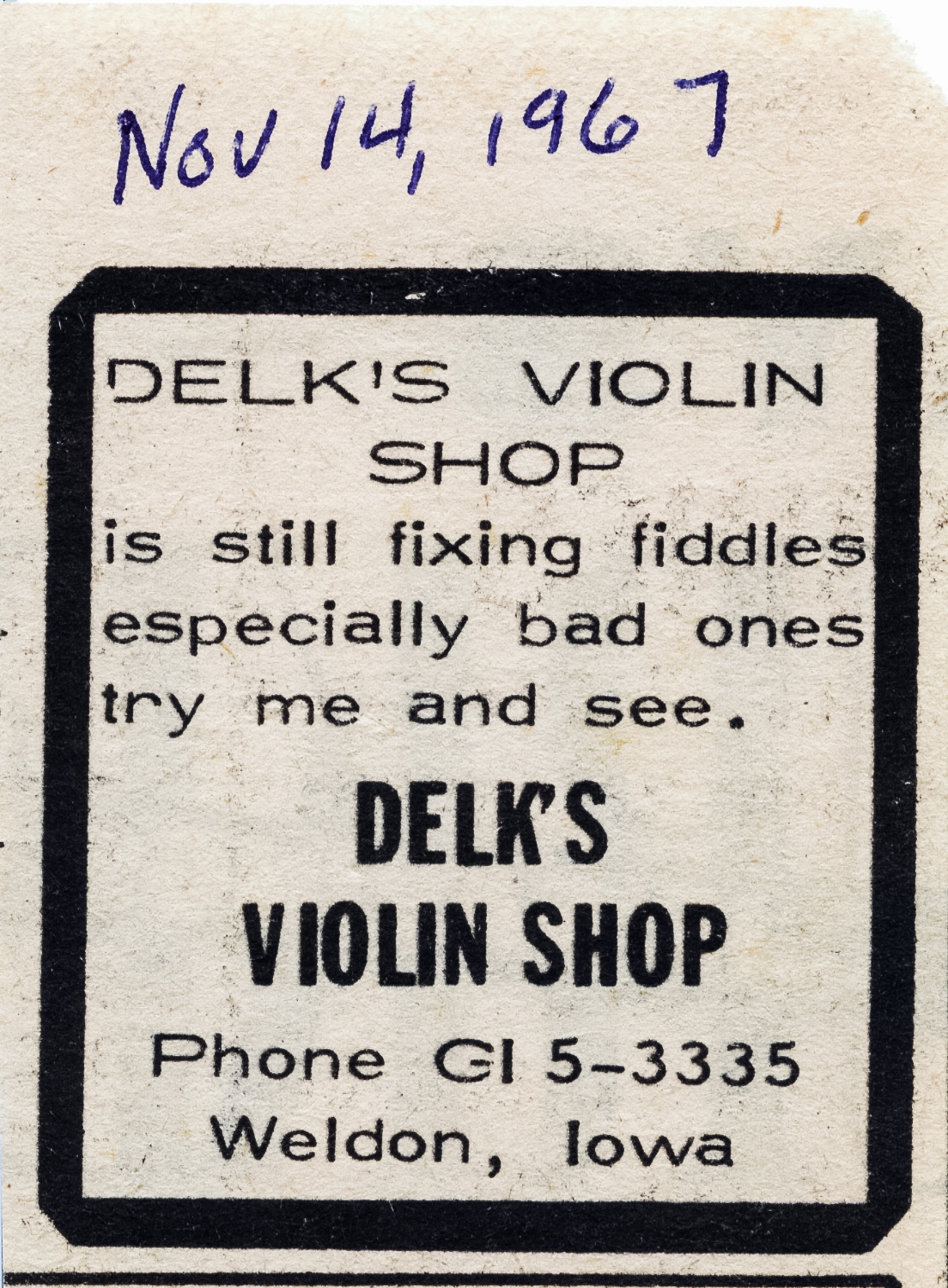 Ad for Delk's Violin Shop, Weldon, Ia which appeared in "The Advertiser" on November 14, 1967. Franklin Elsworth Delk |