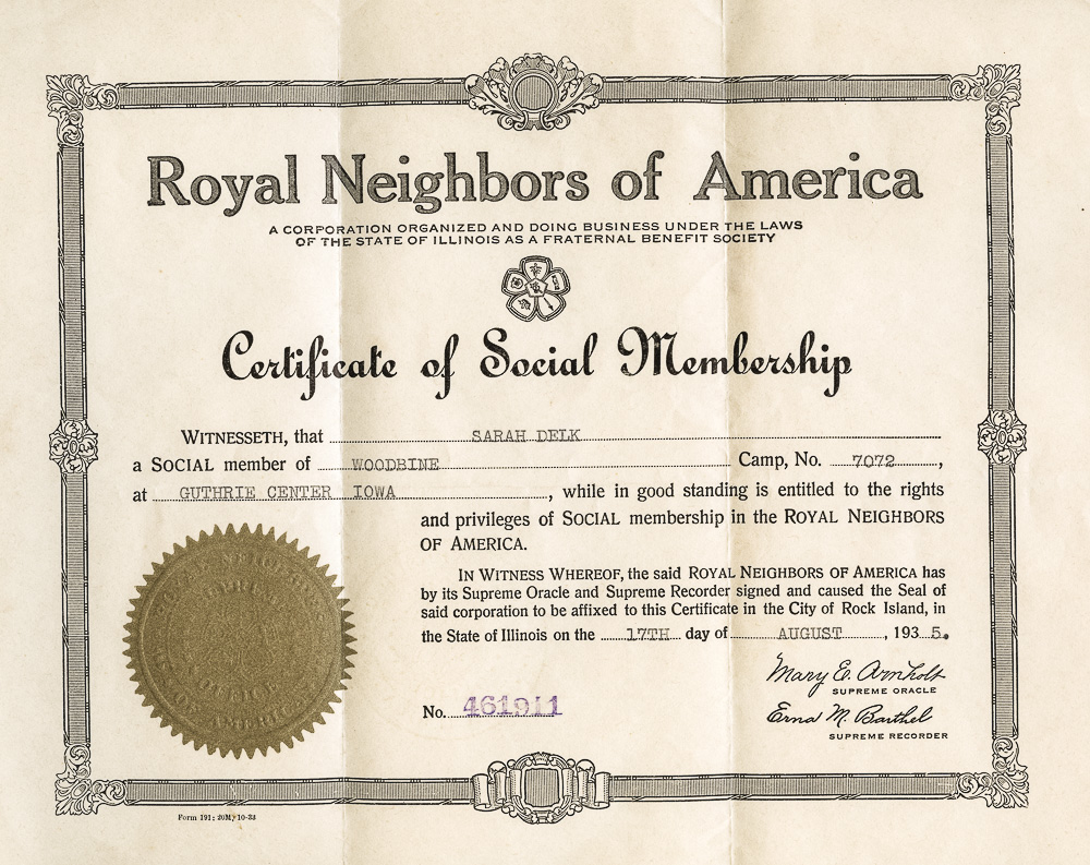 Membership certificate in Royal Neighbors of America for Frank Delk's wife |