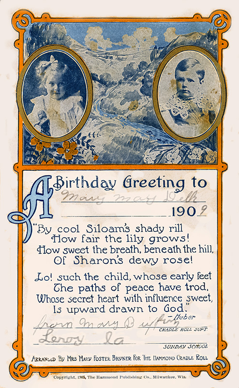 Birthday card sent to Mary May Delk from Mary Buffon (sp?), LeRoy, Iowa dated 1909.