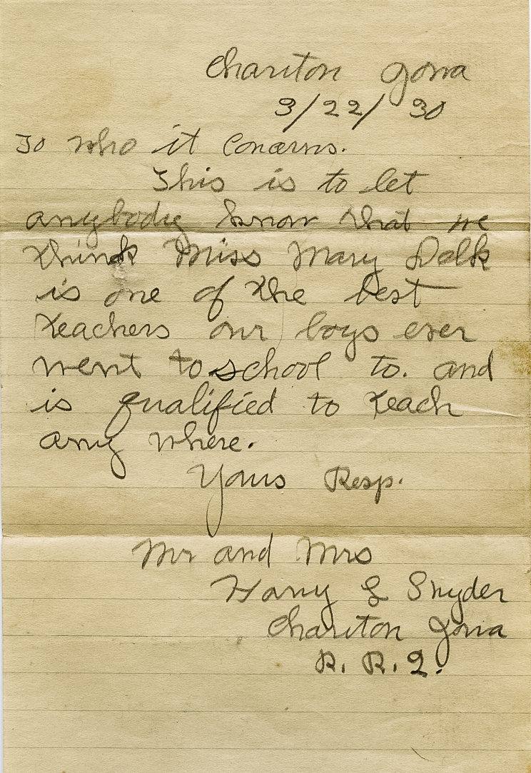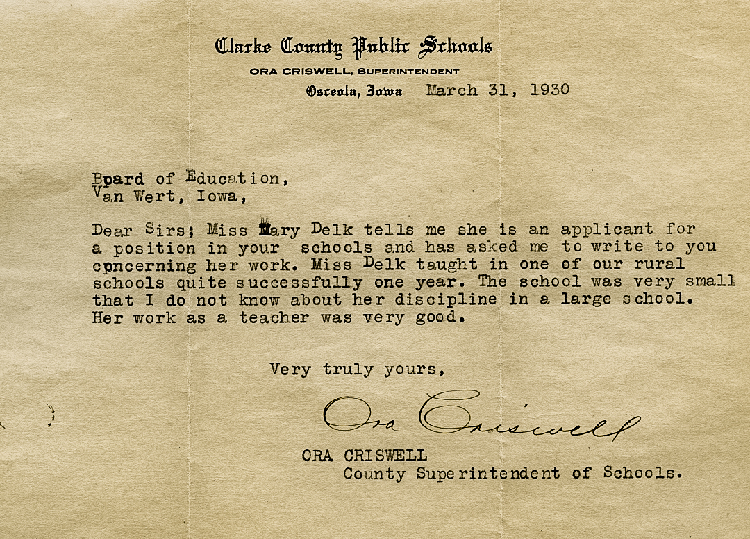 Recommendation for Mary May Delk, written by the County Supererintrndent of Schools, Clarke County, Iowa and dated March 31, 1930.