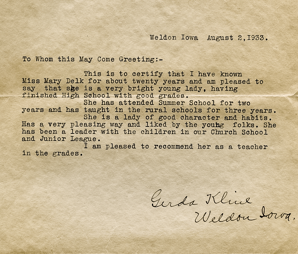 Recommendation for Mary May Delk, written by a resident of Weldon, Iowa and dated August 02, 1933.