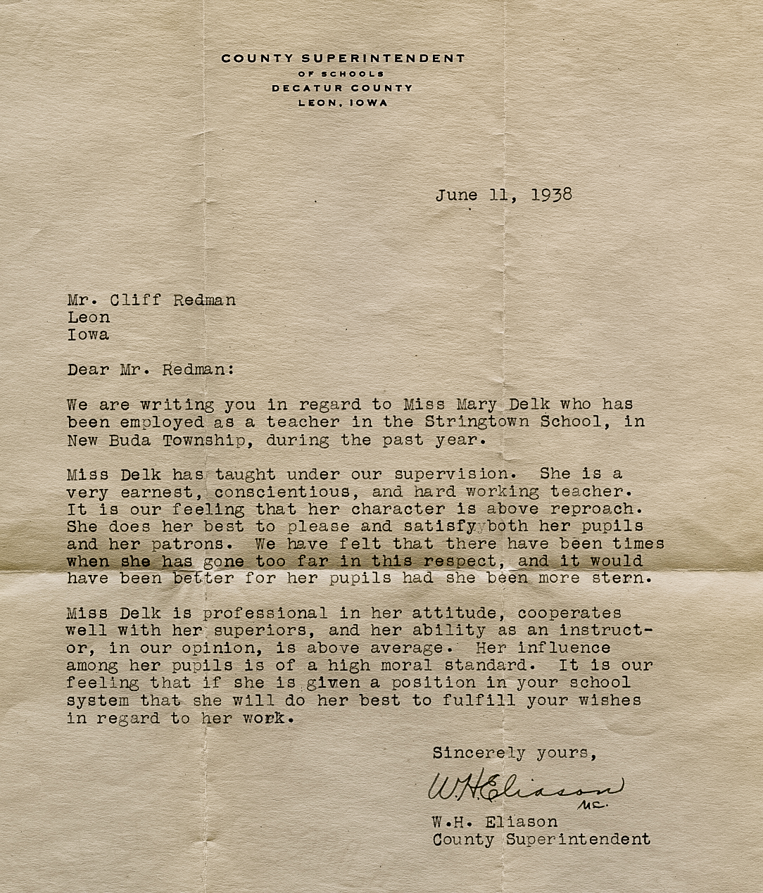 Recommendation for Mary May Delk, written by the County Superintendent of Schools, Decatur County, Iowa and dated June 11, 1938.