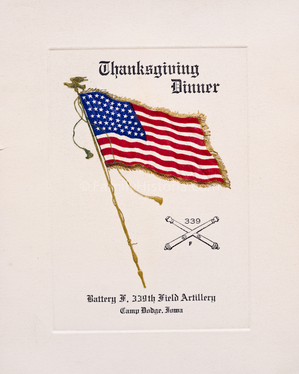Cover of Thanksgiving dinner menu from Battery F. 339th Field Artillery, Camp Dodge, Iowa, November 1917. Russell L. Delk was a member of this unit.