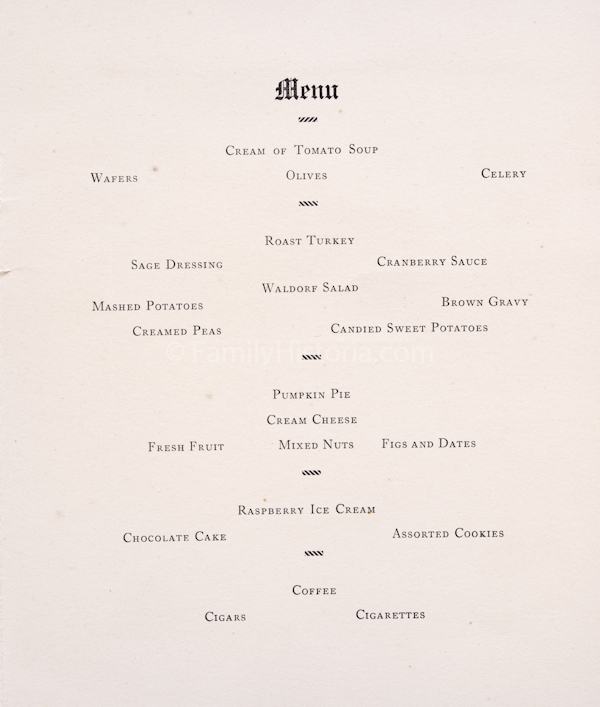 Thanksgiving dinner menu from Battery F. 339th Field Artillery, Camp Dodge, Iowa, November 1917. Russell L. Delk was a member of this unit.