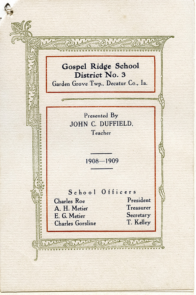 Souvenir of 1908-1909 School year at Gospel Ridge School District No. 3 presented by John C. Duffield, Teacher. Pupils names include Ira Leslie Delk, Charles Wesley Delk and Russell Leland Delk