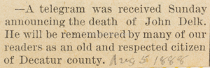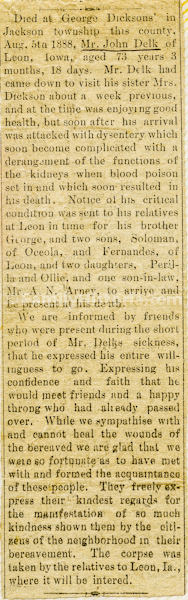 On September 4, 1887, John's wife died. Shortly thereafter John returned to Ohio and Indiana where several of his brothers and sisters lived. He stayed until the spring of 1888 when he returned to his home accompanied by his brother George Washington Delk (See George's Journal.) While John was away, his grandson lived with his daughter, Priscilla Laura.