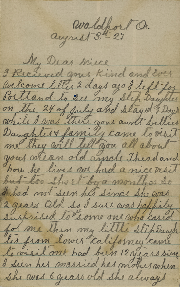 I Recieved your kind and Ever welcome letter 2 days ago I left for Portland to see my Step Daughter on the 24 of July and stayed 3 Days while I was there your aunt Lillies Daughter & family came to visit me they will tell you all about your mean old uncle Thead and how he lives we had a nice visit but too short by a month or so. I had not seen her since she was 2 years Old so I sure was happily surprised to see some one who cared for me then my little step Daughter from lower Californey came to visit me had been 12 years since I seen her married her mother when she was 6 years old she always loved he Old sep dad alway wrote to me always caled me father or Papa my niece beged me to go to Iowa with them & my Daughter to Calf with them but I am still here and will be a while yet as I am sure not improved very fast Dear and dont ever expect to be well again but I am not a Pauper so I dont have to spong off of no one